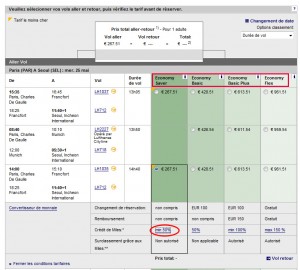 Même si les types de tarifs sont importants, ce n’est pas facile (voir parfois impossible) de les trouver. Chez Lufthansa par exemple, ils vous montrent les différents tarifs disponibles avec le montant de miles à gagner. Mais vous pouvez aussi les trouver sur un site moteur de recherche comme kayak.fr, ou j’ai cherché Paris-New York et trouvé le vol Air France suivant:
