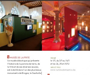 J’ai vite regardé sur le site de tourisme officiel http://www.tourismebelgique.com/destinations/brugge-bruges et a découvert qu’en plus des canaux et anciens immeubles (assez similaire à Amsterdam enfin…) il y a une Musée de la frite! Ça c’est typiquement Belge:) « Ce musée présente l’histoire de la pomme de terre, de la frite et de ses diverses sauces. Il est installé dans l’un des plus beaux monuments de Bruges, le Saaihalle. »