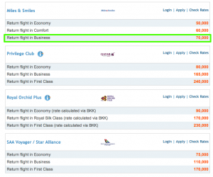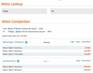Grâce à Philipp j’ai découvert un outil très utile en complément de Award Wallet que j’ai conseillé pour suivre tous vos comptes de fidélité en un seul clic: le site s’appelle www.milez.biz et permet de comparer le prix des billets primes parmi les différents programmes de fidélité pour un trajet. Je passe pas mal (trop) de temps à trouver les tableaux de primes sur les sites de programmes de fidélité, donc grâce au milez.biz j’économise énormément du temps.