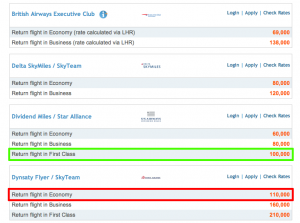 J’ai souligné des primes les plus et moins chers en vert et rouge. Donc pour un Paris-Tokyo A/R la prime en classe économique qui coute les moins de miles (on ne connaît pas les taxes…) est chez JAL (OneWorld) à 45.000 miles seulement et le pire est China Airlines (Skyteam) à 105.000 miles.