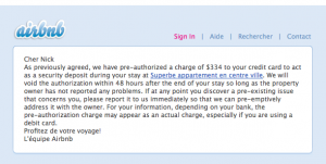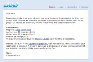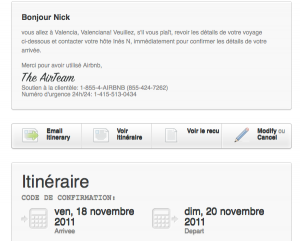 Apres avoir envoyé la demande on a toute de suite reçu un confirmation de la demande par AirBnB. On note que c’est un site Américain et ils mélangent français/anglais (peut être je dois commencer d’écrire aussi en franglais…). Les hôtes répondent sous 24h.