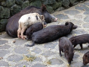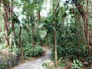Nous nous arrêtons quelques minutes pour les regarder puis nous continuons notre route. Sur le chemin, de nombreux poissons sont présents et notamment des carpes japonaises. Nous passons rapidement la partie « jungle » du parc de peur de nous faire dévorer par les moustiques. Cette partie du parc est très bien entretenue mais il n’en reste pas moins que la végétation tropicale attire les moustiques qui se régalent de notre peau fine de métropolitain… On arrive finalement aux tortues. Adorant les tortues, je trépigne de joie et je ne suis pas déçue ! On voit ces énormes tortues dans leur enclos. Et là stupeur… pas de grille, pas de barrière… On entre dans l’enclos. Certains donnent à manger aux tortues, les caressent gentiment. Personnellement, très peu pour moi, on m’a toujours dit qu’il ne fallait pas toucher les tortues ou dans ce cas, aller tout de suite se laver les mains. Bon, en même temps ce conseil date de mon enfance… A la suite de cela, on voit des tortues dans de petits parcs à différents niveaux de maturité. C’est fou comme ça grandit vite ces bêtes là ! Il y a d’autres espèces de tortues aux couleurs jaunes absolument splendides. Après un tour des enclos, nous repartons à la découverte du parc.