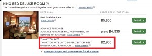 J’ai comparé les prix et c’est encore plus intéressante que leur promo Any Weekend Anywhere a -40%, mais qui est disponible qu’en Week end non-remboursable. Bangkok est une ville avec une énorme choix des hôtels de grande qualité pour des prix raisonnables, donc j’hésite encore de rester dans une chaîne comme Hilton ou Starwood, ou prendre quelque chose plus charmant. Dans tous les cas la réservation est flexible jusqu’à 16h le jour d’arrivée (au moins au Conrad Bangkok.) Lisez attentivement les conditions d’annulation avant de réserver.